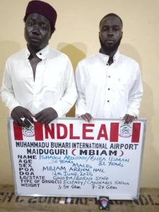 While 14 jumbo sacks of skunk weighing 560kg were recovered from a wooden boat at Oniru beach in Lagos by operatives of the Marine Command of NDLEA on Thursday 12th June, officers of the Muhammadu Buhari International Airport Maiduguri (MBIAM) same day arrested two businessmen: Ishaku Abdullahi, 30; and Buba Usman, 32, at the arrival hall of the domestic wing of the airport with various quantities of ecstacy pills and skunk packaged in fanciful wraps labelled as ‘Lychee’ and ‘Porro Legal’